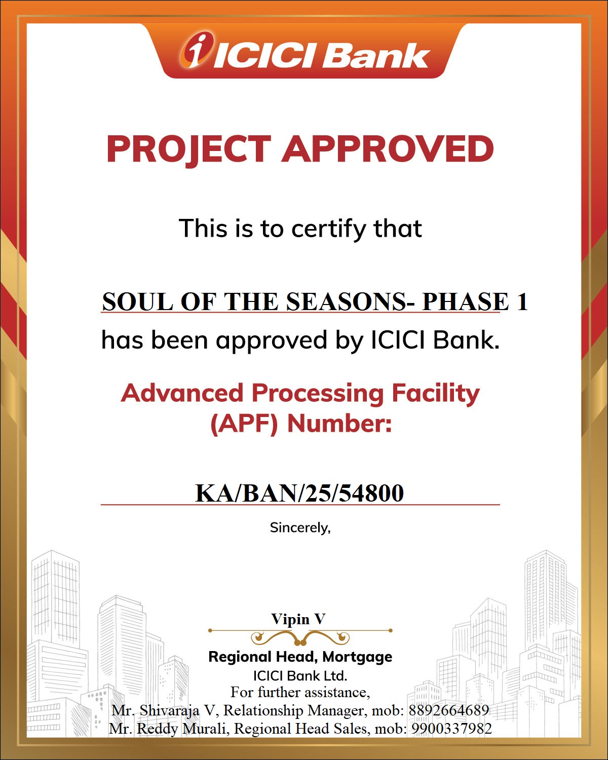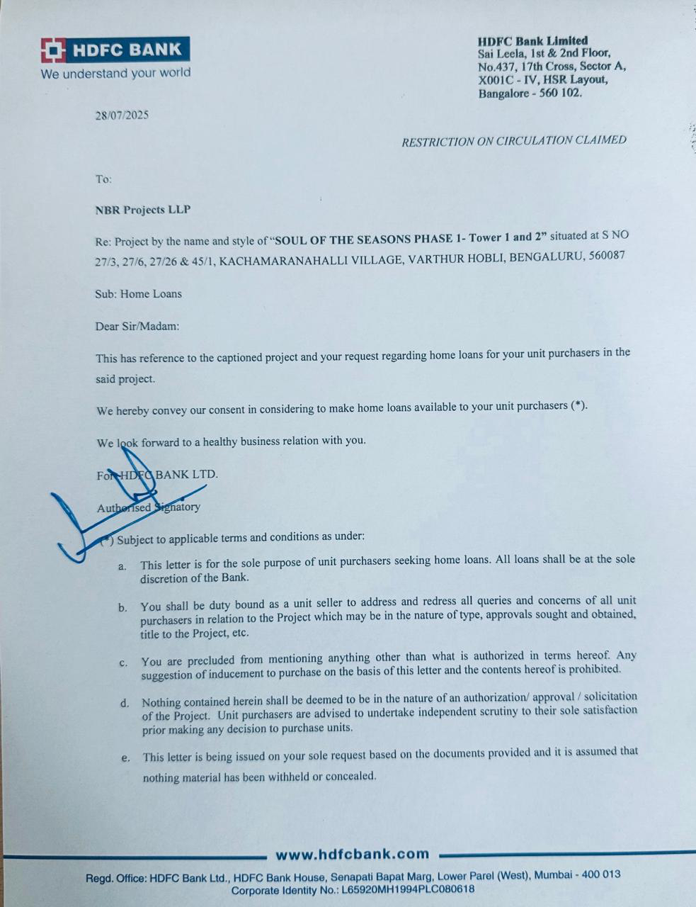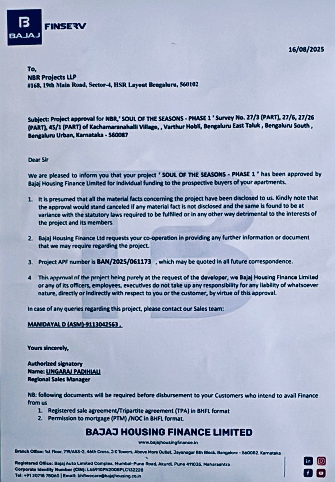 Yes. NBR's Soul of the Seasons is BDA-approved, ensuring the project follows all development norms and legal guidelines. This approval also makes it easier for buyers to gain confidence in the project’s transparency and reliability.
